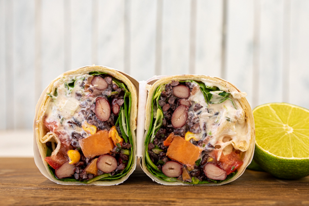 τορτίγια σπανάκι 30 εκ., μαρούλι iceberg, μαύρο ρύζι, κόκκινα φασόλια, γλυκοπατάτα,