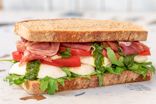 προζυμένιο ψωμί, ρόκα, προσούτο San Danielle, φρέσκια μοτσαρέλα, ντομάτα, Βuddha’s