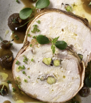 2129_galopoularoloport.jpg Γαλοπούλα ρολό τυλιγμένη με μπέικον, γεμιστή με φιστίκια Αιγίνης, πουρέ από χουρμάδες και σάλτσα μανιταριών ΔΕΣ ΤΗ ΣΥΝΤΑΓΗ