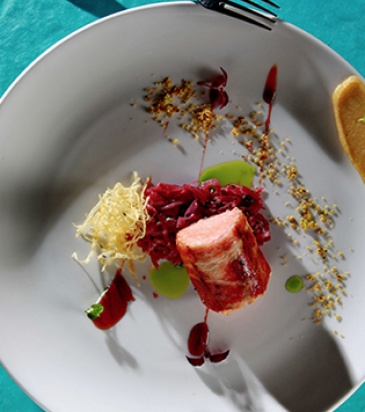 3313.jpg Σολομός τυλιγμένος με μπέικον, κόκκινο λάχανο μπρεζέ, πουρές μήλου και σιρόπι Port ΔΕΣ ΤΗ ΣΥΝΤΑΓΗ