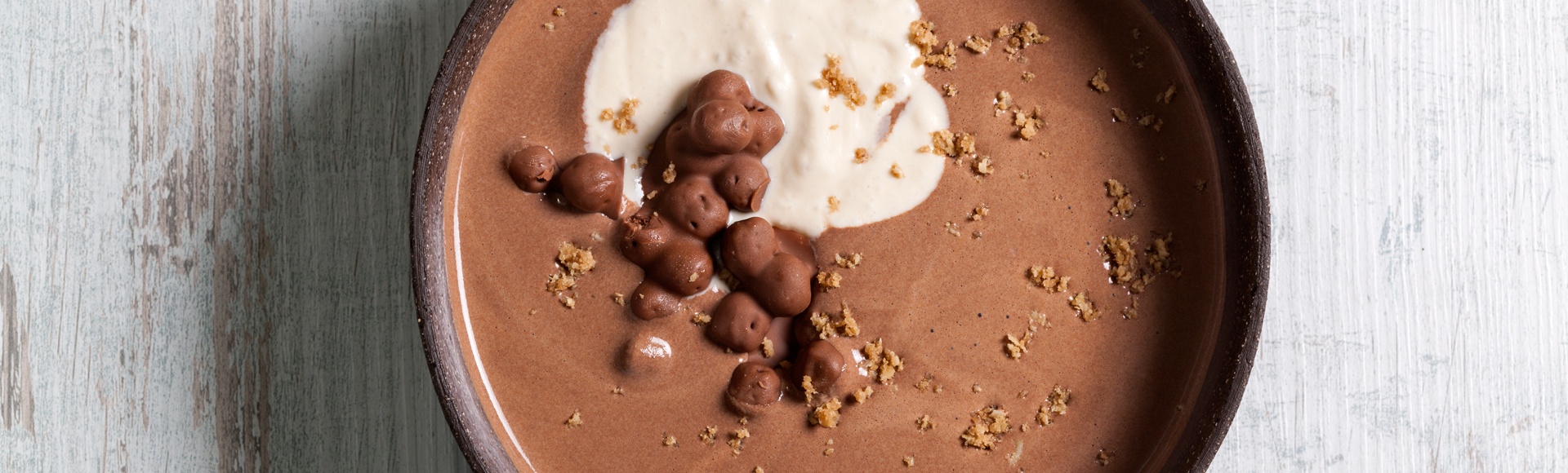 Σερβίρουμε τη σούπα με το αφρόγαλο και τα δημητριακά σοκολάτας.