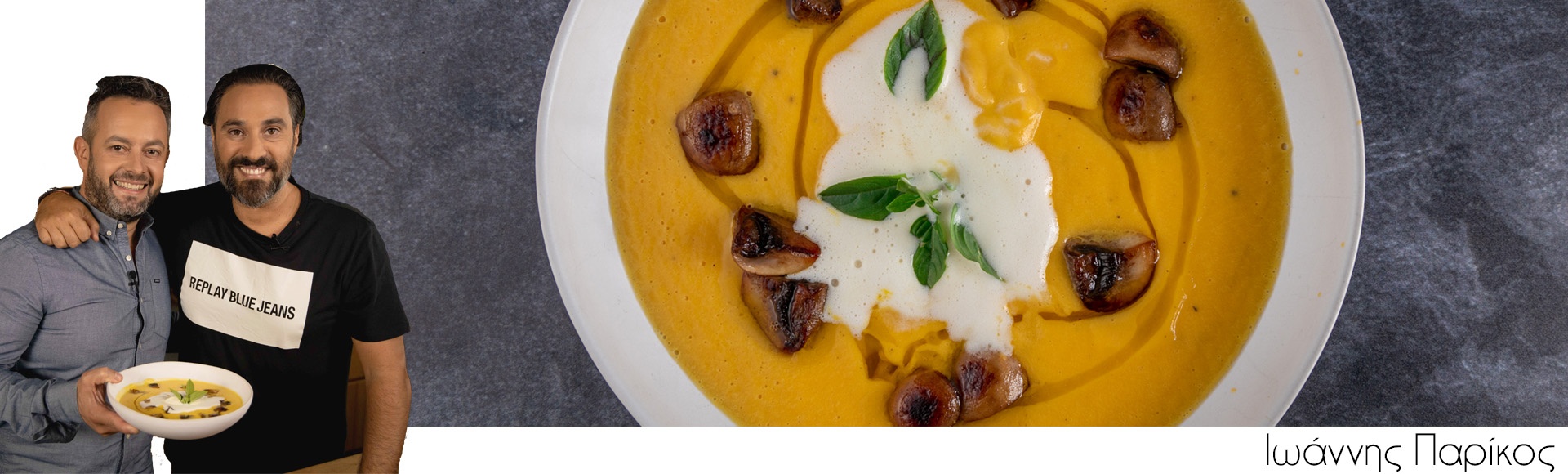 Σε ένα πιάτο τοποθετούμε την σούπα κολοκύθας. Γαρνίρουμε με τα μανιτάρια, το βασιλικό και τη σαντιγί τρούφας.