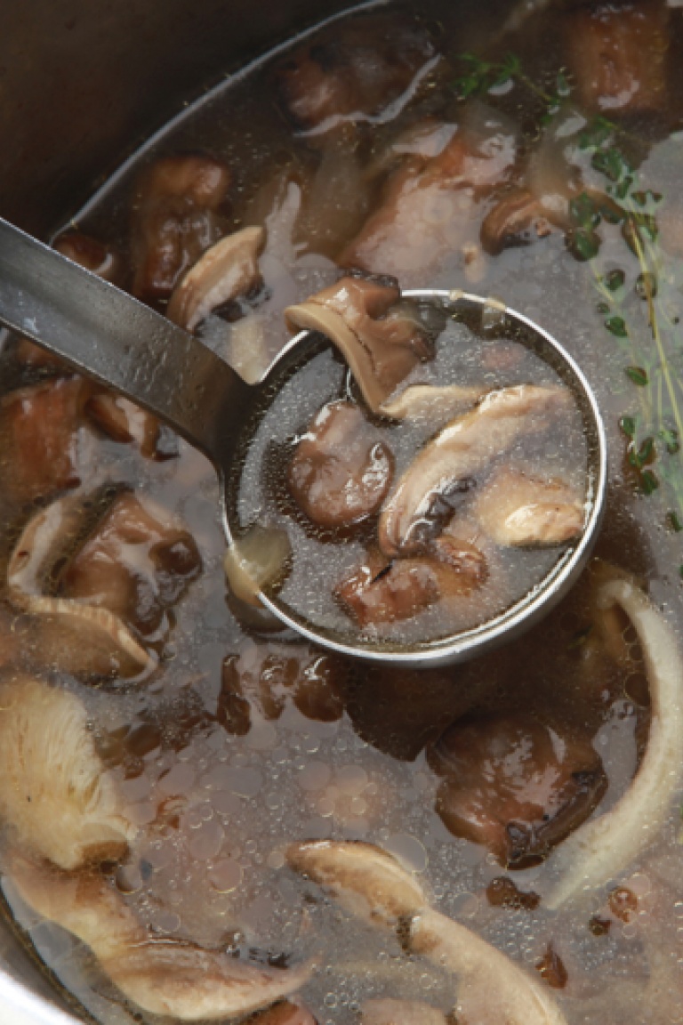 Ξεπλένουμε καλά με κρύο νερό τις φτερούγες και τα κόκαλα και αφαιρούμε τα εντόσθια που τυχόν έχουν παραμείνει προσκολλημένα σε αυτά. Ρίχνουμε σε μια κατσαρόλα (μαρμίτα κατά προτίμηση, δηλαδή στενή και ψηλή) το νερό, τις φτερούγες και τα κόκαλα και τα φέρνουμε σε βρασμό, ξαφρίζοντας αμέσως μόλις αρχίσει να δημιουργείται αφρός. Χαμηλώνουμε τη θερμοκρασία, ώστε ο ζωμός να κοχλάζει πολύ αργά και «τεμπέλικα». Από τη στιγμή του βρασμού, ο συνολικός χρόνος μαγειρέματος του ζωμού είναι 3 ώρες. Κατά τη διάρκειά του πρέπει να ξαφρίζουμε (κάτι που θα συμβεί από την πρώτη μισή ώρα του μαγειρέματος και έπειτα) προσεκτικά και να αφαιρούμε το λίπος που θα συσσωρεύεται στην επιφάνεια του ζωμού. Ύστερα από 2 ώρες βρασμού προσθέτουμε το κρεμμύδι, το καρότο, το σκόρδο και τη δάφνη. Στις 2 ώρες και 45 λεπτά προσθέτουμε τον μαϊντανό και το θυμάρι. Όταν συμπληρωθούν οι 3 ώρες βρασμού, αποσύρουμε την κατσαρόλα από τη φωτιά και σουρώνουμε τον ζωμό σε ψιλή σήτα. Τον κρυώνουμε γρήγορα και τον διατηρούμε στο ψυγείο. Όταν στο ψυγείο παγώσει ο ζωμός, αφαιρούμε το λίπος που έχει συσσωρευτεί στην επιφάνειά του.