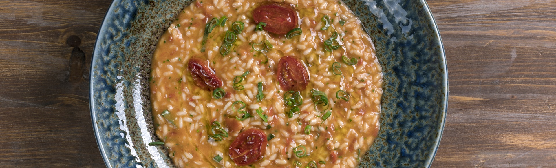 Ζεσταίνουμε μια κατσαρόλα σε μέτρια προς δυνατή φωτιά, προσθέτουμε το ελαιόλαδο και ιδρώνουμε το κρεμμύδι μέχρι να μαλακώσει καλά και να πάρει ελαφρώς ξανθό χρώμα. Προσθέτουμε το ρύζι και τσιγαρίζουμε για 2-3 λεπτά περίπου. Σβήνουμε με το κρασί και αφήνουμε να απορροφηθεί εντελώς. Προσθέτουμε τον ζεστό ζωμό σε μικρές δόσεις, ανακατεύοντας διαρκώς και περιμένοντας να απορροφηθούν όλα τα υγρά πριν ξαναρίξουμε. Η ποσότητα του ζωμού θα πρέπει να είναι τόση κάθε φορά ώστε να καλύπτει σχεδόν όλο το ρύζι. Προσέχουμε επίσης το βράσιμο να είναι χαμηλό, αλλά υπαρκτό. Αλατίζουμε και, όταν το ρύζι γίνει al dente, προσθέτουμε τη σάλτσα ντομάτα και τις λιαστές ντομάτες και συνεχίζουμε μέχρι να έρθει στο επιθυμητό χύλωμα. Αποσύρουμε την κατσαρόλα από τη φωτιά και προσθέτουμε το βούτυρο, την παρμεζάνα, την ντομάτα κονκασέ και τα μυρωδικά.