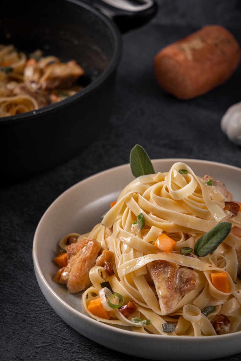 Βράζουμε τα λιγκουίνι σε καλά αλατισμένο νερό 2 λεπτά λιγότερο από τις οδηγίες του κατασκευαστή. Σουρώνουμε κρατώντας 100 γρ. από το νερό που βράσανε.